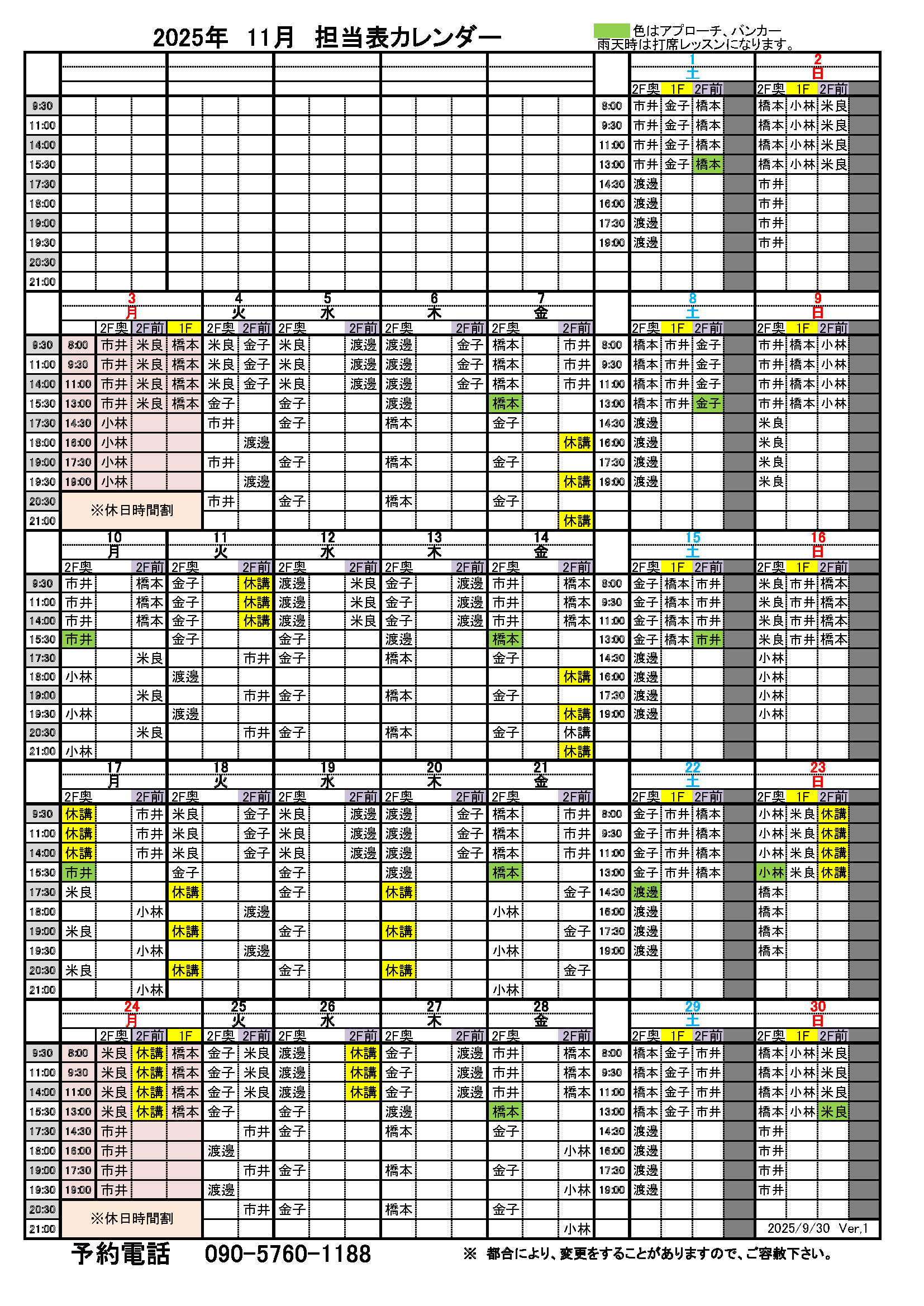 | 1レッスン | チケット1枚(施設利用料を含む) ※土日祝は別途ボール代として660円必要です。 ※レッスンは現金での受講はできません。 |